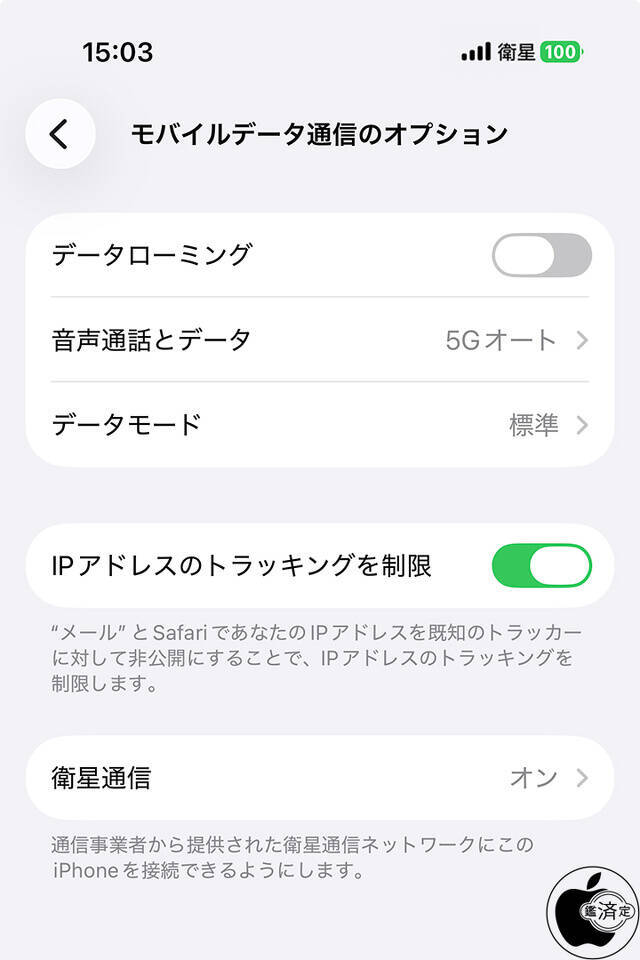 設定>モバイル通信>モバイルデータ通信のオプションと画面遷移後「衛星通信」がオンになっているか確認します。