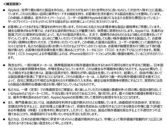 Appleは「残念ながら、⼀部の端末メーカーは、携帯電話端末の残存価値を算出するための不適切な新たな⼿法をご提案し、⽇本国内における端末間競争を弱め、市場を歪めようとしていますが、これは健全な市場競争を損なうものです。Appleと異なり、こうした競合する企業の多くは、製造の品質が劣り、陳腐化が早い製品を⽣産していますので、結果として、⾃由市場においては製品価値が急速に下落することになります。これらの製造メーカーは、⼈為的かつ画⼀的な残存価値の算定を推すことによって、⾃社に実際より不相応な利益をもたらす規制の介⼊を求め、健全な端末間競争を犠牲にすることで、実質的には⾃らの製品の⻑期的な価値の低さを覆い隠そうとしているようなものです。私たちは、⼀律(定率)での残価算定のご提案は、⻑く楽しんでいただける機能と価値を持った質の⾼い製品を創り出しているAppleのようなメーカーに対し、不当な扱いをするものであることから、強く反対します。個々の端末の価値を無視することは、端末市場を歪めるものであり、AppleとAppleのお客様に対して差別的な影響を与えることになります。」と意見を述べています。