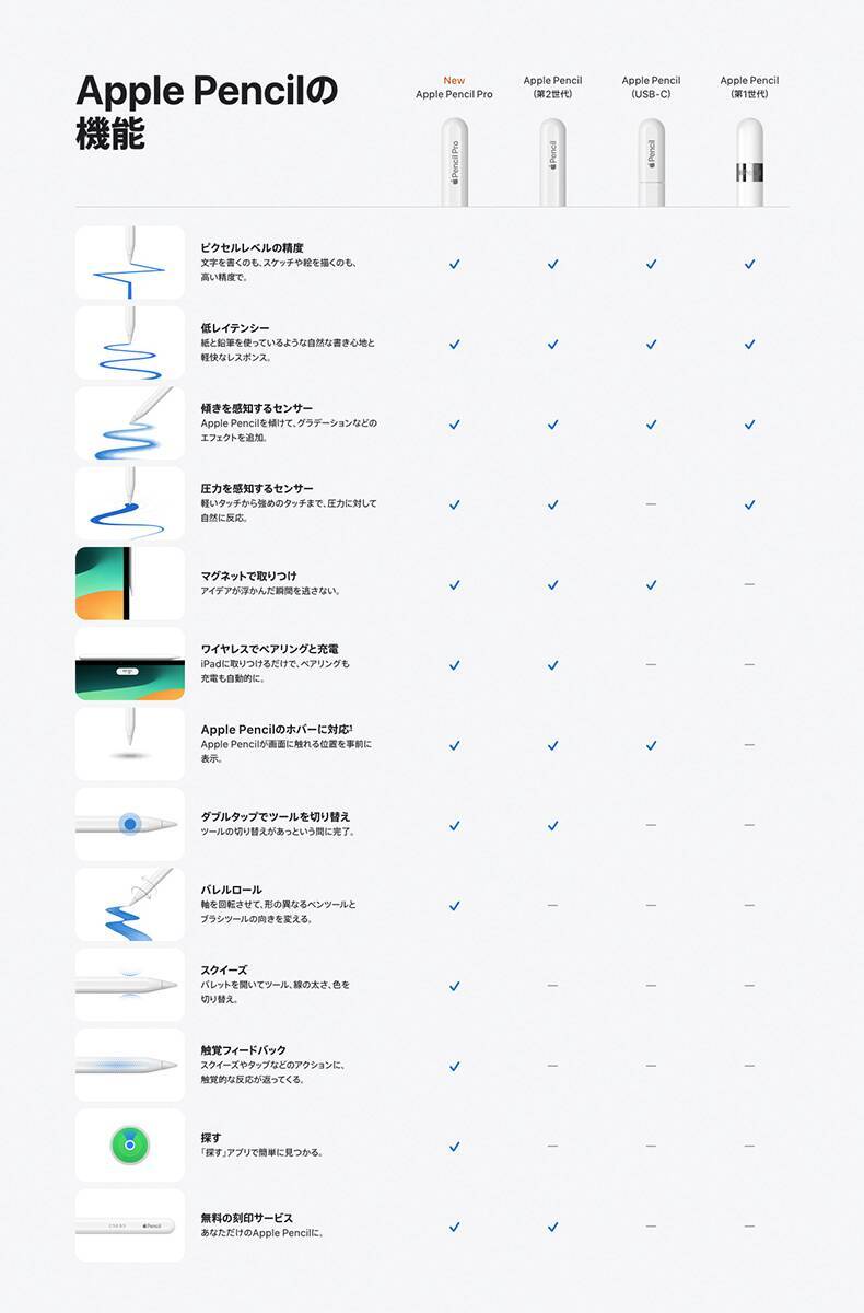 「Apple Pencil」シリーズ各モデルの対応状況 価格対応モデル「Apple Pencil Pro」21,800円(税込)13インチ/11インチiPad Pro(M4)