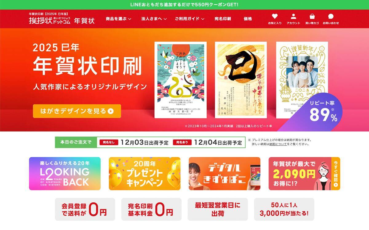 「挨拶状ドットコム」は、年賀状印刷の専門サイトです。多彩なクリエイターとともに制作した数多くのオリジナルの年賀状デザインを提供し、ユーザーは好みのものを選んで印刷注文ができます。今年度は、2025年の干支である「巳」のモチーフが目立ち、そのほかに本来であれば干支にはいない「猫」のモチーフがあることなども魅力です。スタンダードなデザインから個性的な年賀状まで、豊富なバリエーションが取り揃えられています。