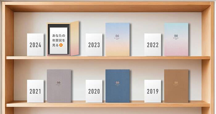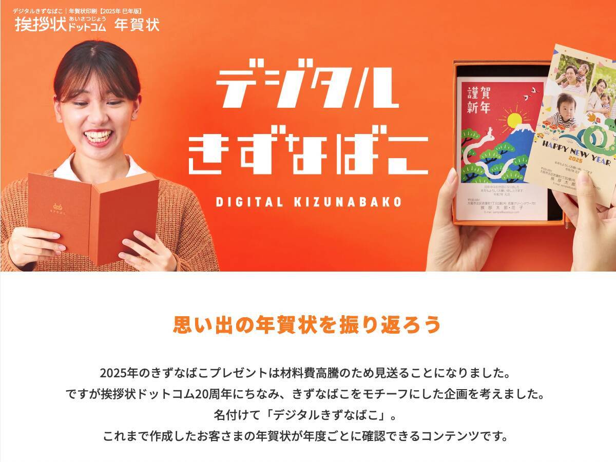 これまで累計138万件以上の利用実績のある「挨拶状ドットコム」は、運営開始から20周年という節目を迎えました。それを記念して、20周年特設ページでは、「挨拶状ドットコム」がユーザーとともに歩んできた歴史を楽しく振り返ることができます。特設サイトからアクセスできるメインコンテンツが「デジタルきずなばこ」です。「デジタルきずなばこ」から会員ページにログインすることで、過去に自身が作成・注文した思い出の年賀状を、年度ごとに確認できます。自分の辿ってきた道はもちろん、家族の歴史や子どもの成長過程、大切な人とのつながりなども、年賀状を通じて懐かしく振り返れることが魅力です。