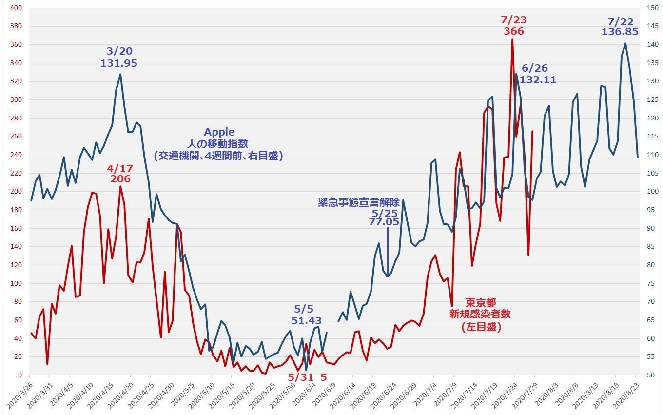 昨日付ブログ記事で示したように、人の移動拡大が4週間後の新規感染者数になって表れる。人の移動指数がピークを付けたのは6月26日。その影響で7月23日に東京で366人の新規感染者数が確認された。