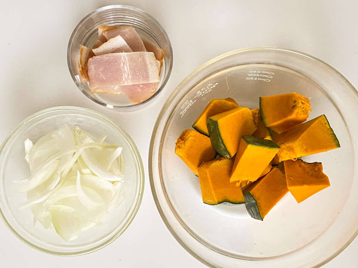 ① ベーコンは1cm幅に切る。玉ねぎはうす切りにする。