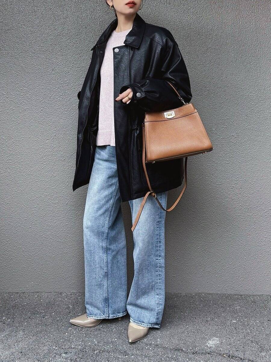 ハードに偏りがちな黒のレザージャケットは、ピンクニットとブルーデニムでほんのり甘さをプラスした大人カジュアルに。春らしい配色で季節感たっぷりに仕上げつつ、レザージャケットで大人っぽさもしっかりキープ。パンプスやバッグできれいめ要素も加えれば、こなれ感が漂うスタイルの完成です。