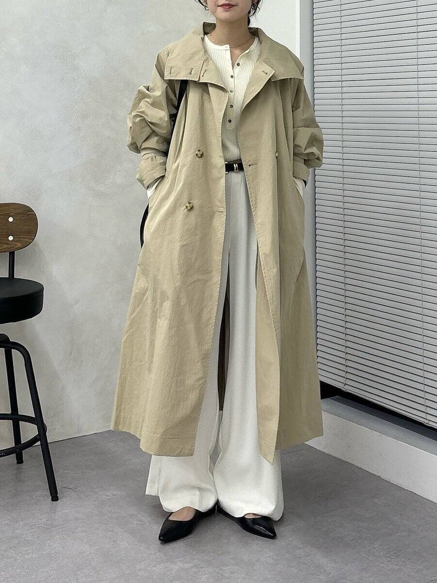 ヘンリーネックリブニット×タックワイドパンツに、ロング丈のトレンチコートをさらりと羽織ったきれいめカジュアルコーデ。上下白でまとめても縦のラインを強調することで膨張見えを回避◎黒小物で全体を引き締め、大人っぽく春らしい軽やかさと上品さを兼ね備えたスタイルの完成。