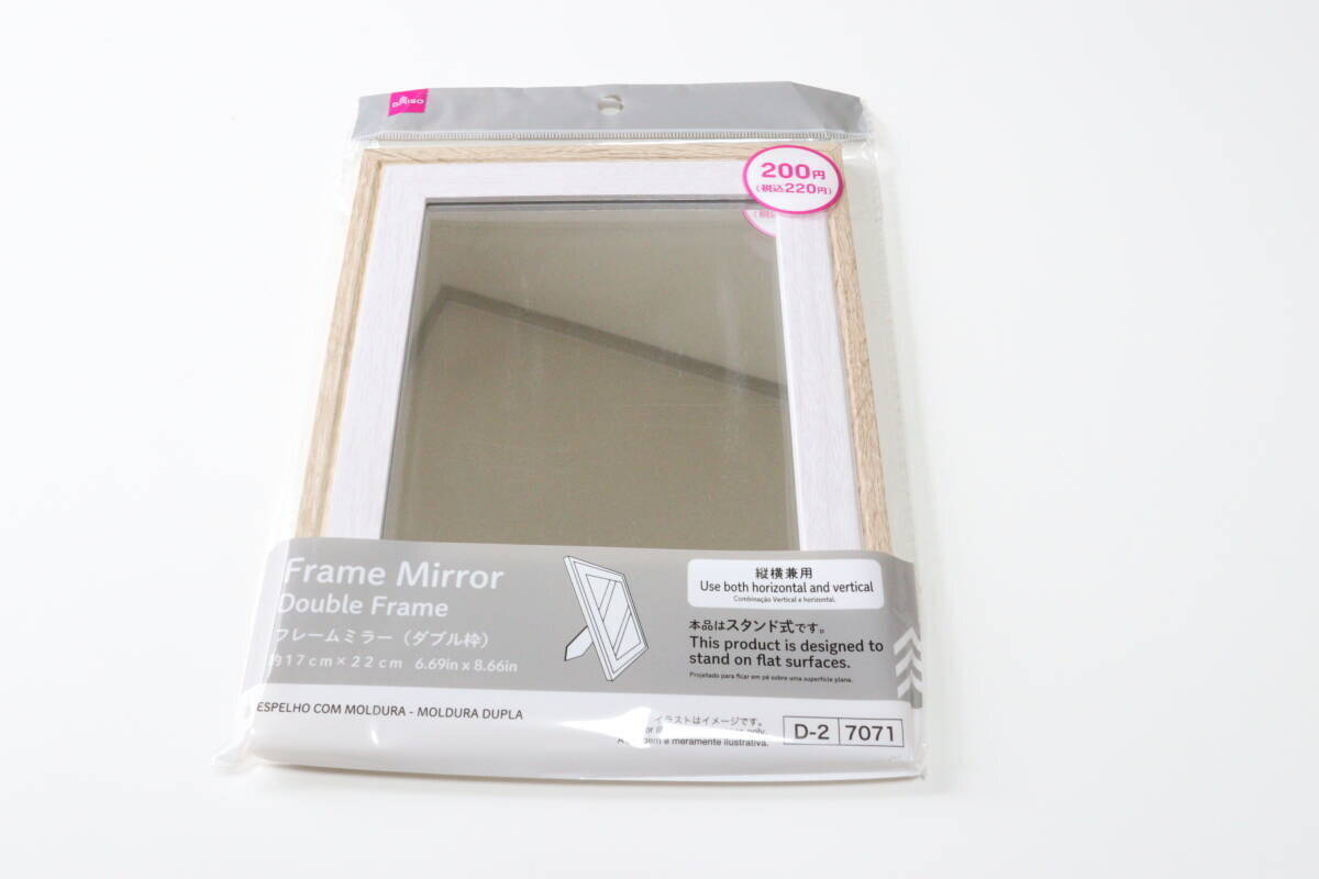 ダイソーをパトロールしていると、美容グッズ売り場で気になる商品を発見。フォトフレームが美容系コーナーに並んでいるのが不思議だな…と思って手に取ったアイテムですが、なんとその正体は鏡!その名も『フレームミラー(ダブル枠)』。お値段は¥220(税込)でした。