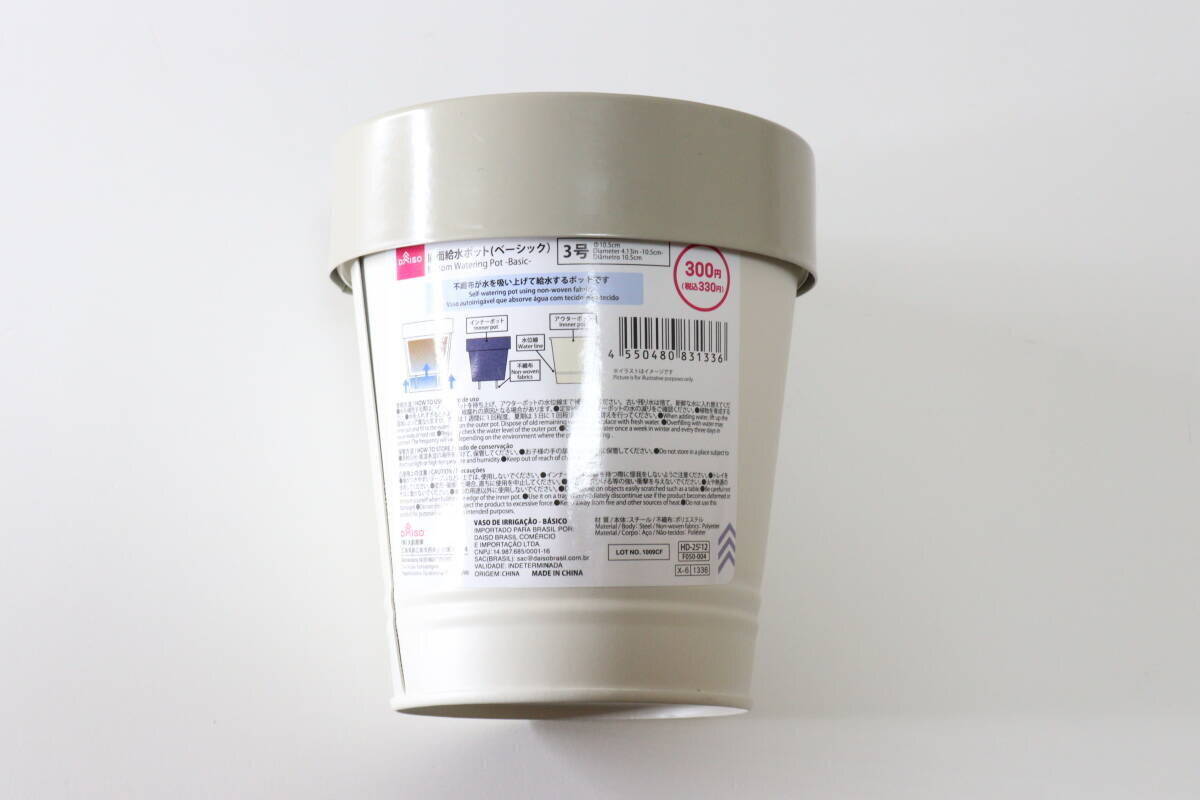 近頃のダイソーは、園芸グッズにかなり力を入れていますよね!先日店舗を覗いてみると、園芸グッズ売り場で本格的な商品を発見しました。今回購入してきたのは、その名も『底面給水ポット(ベーシック)』。お値段は¥330(税込)。