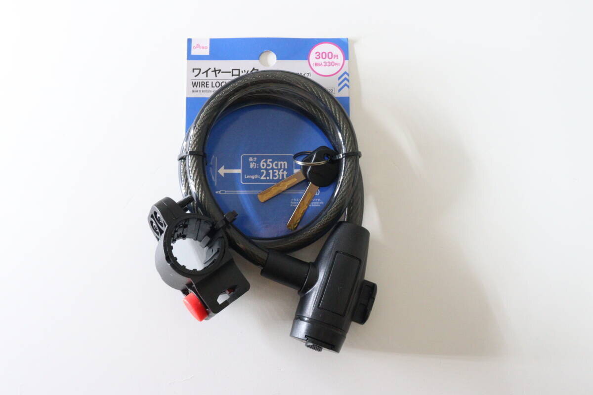 そんな中、ダイソーの自転車グッズ売り場で見つけた『ワイヤーロック(65cm、ブラケット付、鍵タイプ)』は、330円(税込)と破格のお値段!