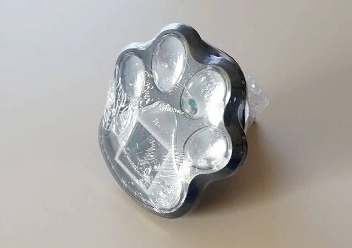 猫の肉球型をしたシルバーのソーラーガーデンライトが袋に包まれた状態で置かれている