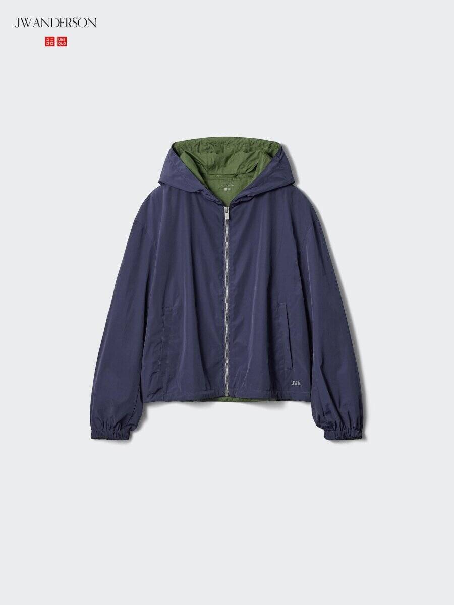 ナイロン裏地と表地を配色にしたおしゃれなウインドプルーフショートパーカ。防風コーティングで風を通さず、撥水加工付きで急な雨も安心です。裾とフードはアジャスターでシルエット調整可能で、裾に施したJW ANDERSONのロゴのリフレクターがさりげないアクセントに。