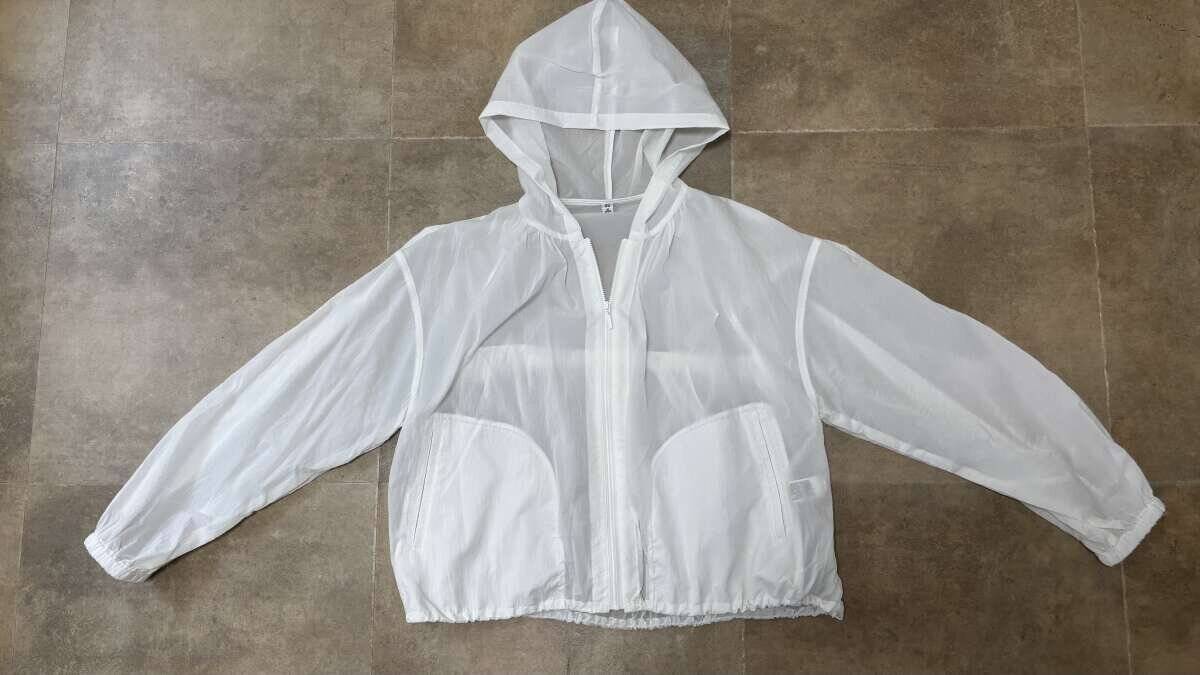 生地は透け感のあるシアー素材で、見た目にも涼しげ。軽くて少しシャカっとしたナイロンっぽい質感で、羽織るだけでスポーティすぎない抜け感をプラスしてくれます。