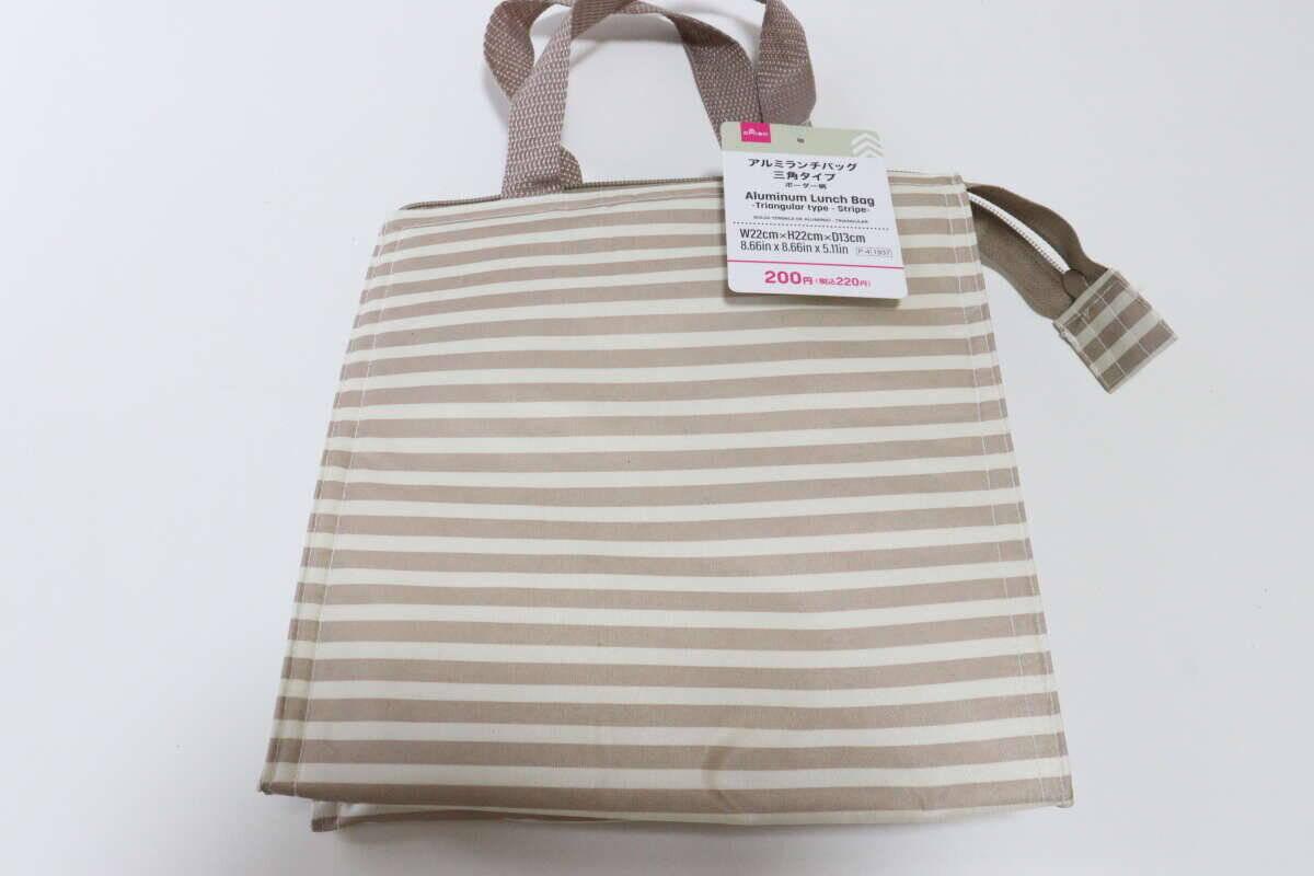 今回はダイソーで購入した『アルミランチバッグ(三角タイプ、ボーダー柄)』をご紹介しました。