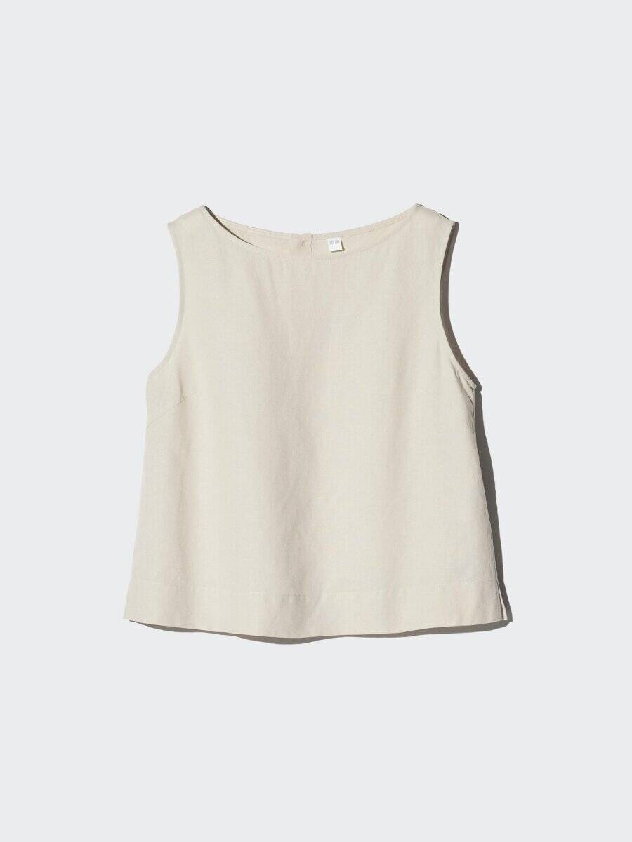 リネンの清涼感とレーヨンのなめらかさを兼ね備えた、着心地抜群のノースリーブブラウス。ショート丈のシンプルデザインで、すっきりとした印象に着こなせます。1枚でさらっと着るのはもちろん、インナーとしても使いやすく着回し力も優秀。