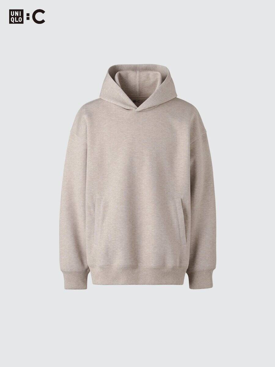 人気シリーズ「UNIQLO:C」の、表面はコットンで適度なハリ感、裏面はポリエステルで滑らかなダブルフェイス素材を使用したオーバーサイズパーカ。