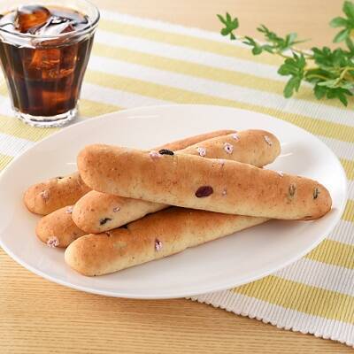 全粒粉・レーズン・クランベリー・オレンジピール・グラノーラを練り込んだ、食べやすい形のスティックパン。