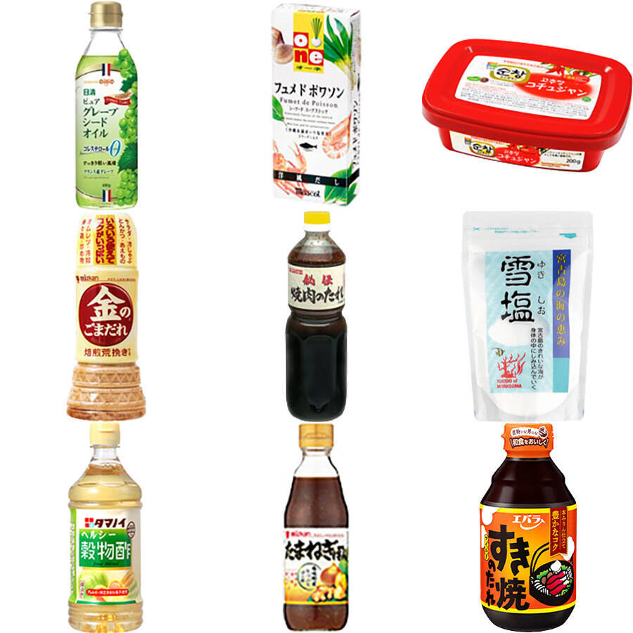 ・砂糖・塩・酢・ポン酢・レモン酢・醤油・めんつゆ・味噌・コチュジャン・だし・ブイヨン・グレープシードオイル・ごま油・ごまだれ・焼き肉のたれ・すき焼きのたれ・塩こうじ・中華調味料・ソース・オイスターソース・トマトソース・ケチャップ・マヨネーズ・マスタード・薬味(チューブ)・胡椒・食べるラー油・七味唐辛子・タバスコ・レモン果汁・シロップ・ジャム・スプレッド・バター・マーガリン・・砂糖1位:スプーン印『上白糖』