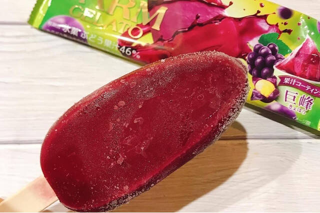 ①なめらかな巨峰ジェラートをジューシー感あふれる柔らかなコーティングで包み込んだバーアイスです。
