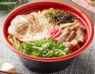 全粒粉入りのもっちりとした太麺です。炊き出した豚骨ベースのコクのある醤油だれが特徴です。豚バラスライス、炙り焼豚刻みの2種類のチャーシューに青ねぎ、高菜、紅しょうが、煎ごまをトッピングしました。2020/10/6発売 -