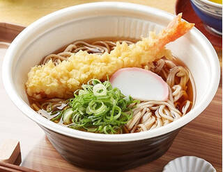 そばの風味豊かなのど越しのよいそばです。地区嗜好性にあった、だし感のあるそばつゆが特徴です。海老天、青ねぎ、赤かまぼこをトッピングしました。別添で「七味」付きです。2020/10/6発売
