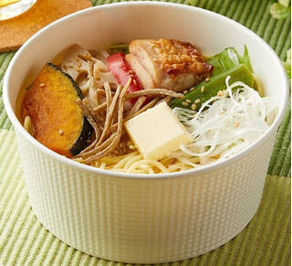 白だしとバターの味わいが楽しめるだしバタ味のパスタです。具材は、かぼちゃやれんこんなど7種の野菜や鶏もも肉をトッピングしました。2020/10/6発売 -