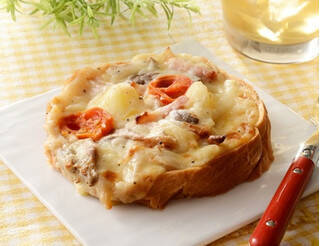 パンの上に6種類のチーズとじゃがいも・トマト・平茸などをのせオーブンで焼き上げたオープンサンドです。