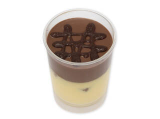 なめらかな食感のバニラブリュレに、濃厚な味わいのチョコプリンを重ねたカップケーキです2022/3/1発売 -