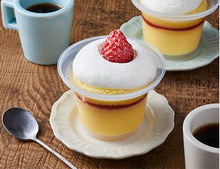 ショートケーキに埋もれるプリン!ショートケーキもプリンも味わえるダブルの楽しみ。おいしいカスタードのためのプレミアムエッグを使用したなめらかなカスタードプリンに、苺ソースとスポンジ、北海道産生クリームと牛乳を使用したブレンドクリームを重ね、まるごと苺を1個トッピングしました。