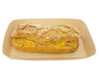 世界の人気パティシエ「ピエール・エルメ氏」監修のスイーツです。歯切れの良いエクレア皮に、甘酸っぱいマンゴーの果肉とソース、ほろ苦いキャラメルクリームを詰めました
