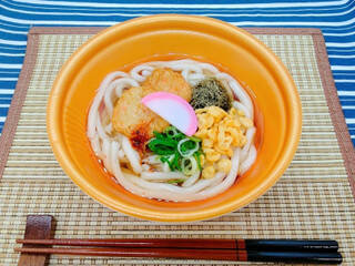 モチモチのうどんと甘く出汁感のあるスープにシンプルな具材を合わせました。南九州らしくさつま揚げをトッピングし、揚げ玉やとろろ昆布で旨味を加えた昔ながらの温めて食べるうどんです。2022/10/25発売