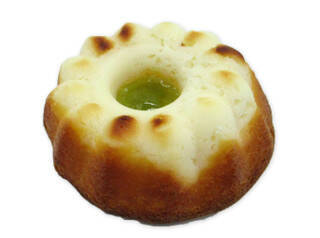 蔵王クリームチーズを配合した生地とふわふわ食感のシフォン生地の2層仕立てのケーキ。真ん中のくぼみにメロン風味ソースを盛付け、蔵王のお釜をイメージしました。2022/11/1発売 -