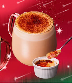 クリーミーなカスタード風味のソースと、エスプレッソ、スチームミルクを合わせ、クレームブリュレの焦げた天面をイメージした、シュガーをトッピングしています。