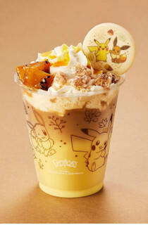 プロントオリジナルのさつま芋ミルクにエスプレッソを加え、ホイップ、さつま芋ダイス、マロングラッセ、さつま芋ソースをトッピングしました。ピカチュウのイエローとイーブイのブラウンを表現し、ピカチュウとイーブイのサクサククッキーと一緒に楽しめるドリンクです。
