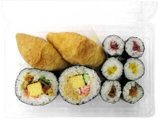いなり寿司2個と五目太巻カニカマサラダ太巻カツオ大根細巻干瓢細巻梅細巻を各2巻詰め合わせたお寿司です。2023/11/14発売