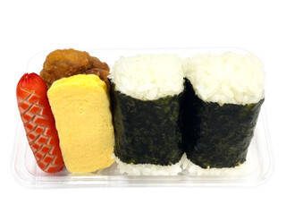 定番の唐揚げ玉子焼き赤ウインナーを組み合わせたおむすびセットです。2023/11/7発売 -