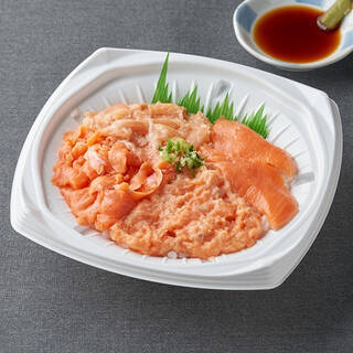 銀鮭スライス、銀鮭切り落とし、ハラス切り落とし、鮭トロを使用しています。 それぞれのサーモンの食感や味わいを存分に味わえるよう、サーモンのみで仕立てたサーモン三昧な海鮮丼です。 ※静岡県の一部では取り扱いがございません。
