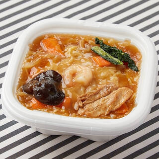 かきたま入りの辛旨スープにもち麦とごはんを入れたスープごはんです。辛旨そぼろ・豆腐・ねぎ・にらが入っています。にんにくや赤唐辛子の刺激と、豚肉や鶏ガラスープの旨みが楽しめます。2024/9/10発売 -