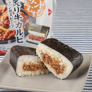 炙り焼きしたアンガスビーフのカルビを甘辛いタレで味付けし、マヨネーズと一緒にサンドしたおむすびです。2025/6/24発売 -