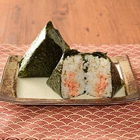 バナーで炙った色鮮やかで鮭本来の旨味を味わえる紅鮭のほぐし身を包んだもち麦入りおにぎりです。