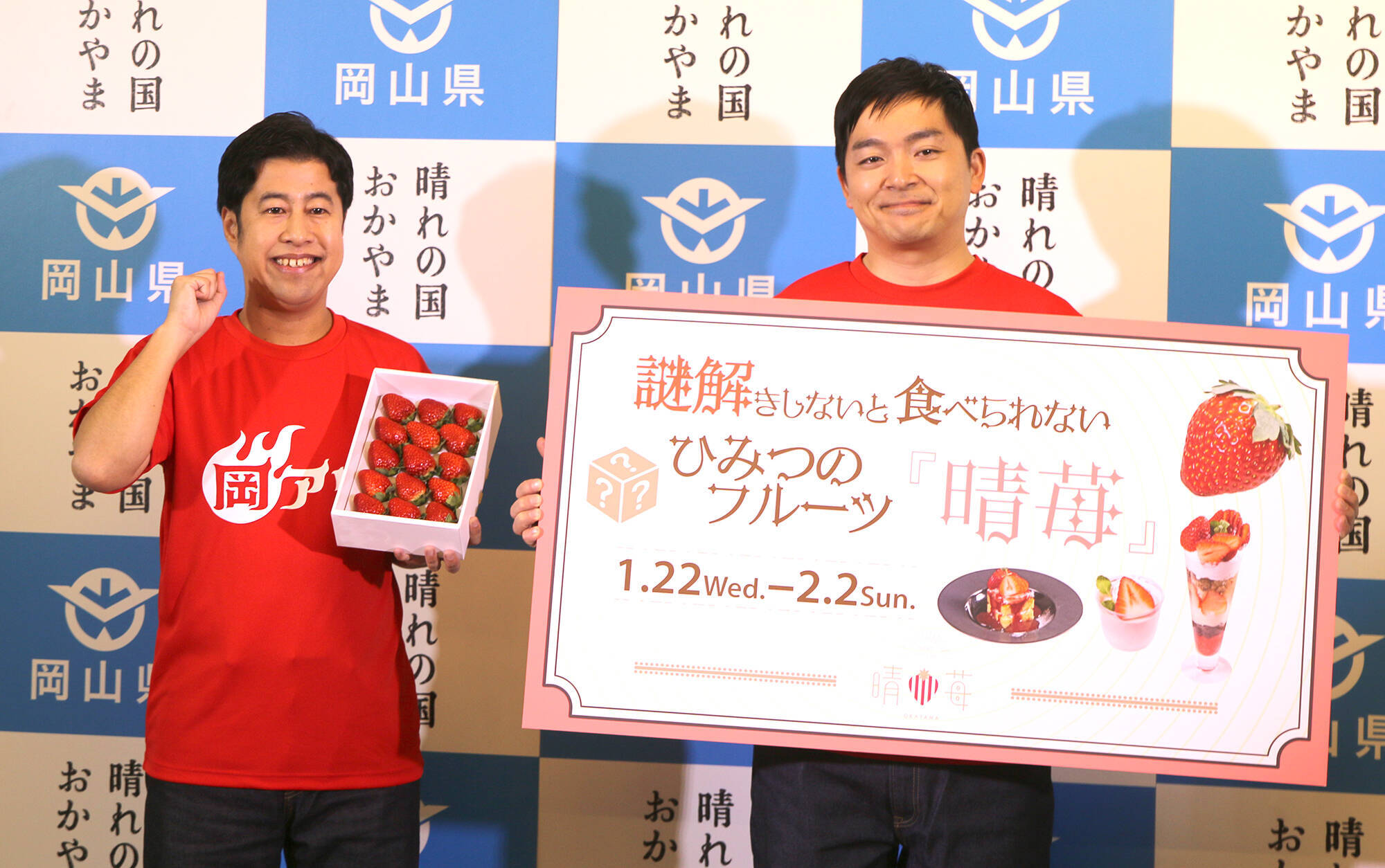 1月21日、東京・新橋にあるアンテナショップ「とっとり・おかやま新橋館」にて、一風変わったスイーツフェア「謎解きしないと食べられない ひみつのフルーツ『晴苺』」の記者発表会が開催されました。このフェアを盛り上げるべく、岡山県出身のお笑いコンビ・ウエストランドが登場しました。