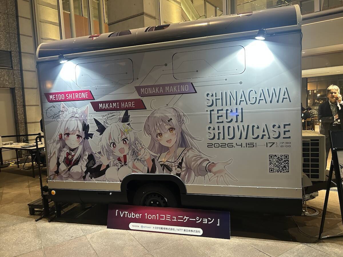 開場直後から列が伸びたのは、トヨタ自動車とNTT東日本が組んだVTuberとの1on1コミュニケーション空間だった。トヨタの可動産事業で使うラッピング済みのモビリティを会場に持ち込み、NTT東日本の次世代光通信で遅延を抑えたうえでVTuberとの対面を実現する実証実験で、初日17時からはメディア向けの体験枠も用意されていた。