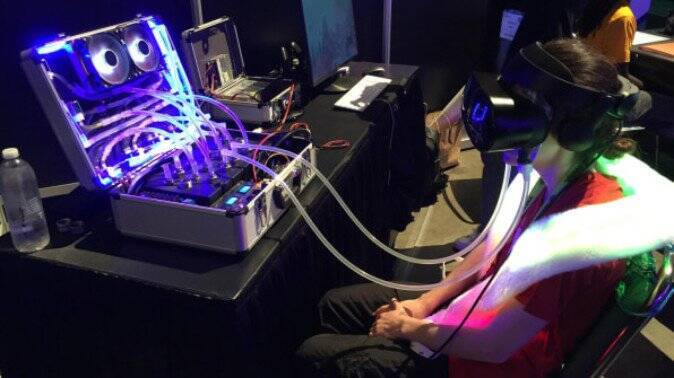 カンファレンスでは、「LiquidMask」のデモンストレーションが行われました。海の中に潜るVRスキューバダイビング体験では、海の奥深くへ潜れば潜るほど、液体の温度は下がり、マスク内の液体の量は水圧を再現するため増加します。開発者のレポートには、魚の群れが通り過ぎれば、頭の上に水の流れを感じるという、触覚デバイスは、よりリアルなダイビングのVR体験が提供できると記述されています。
