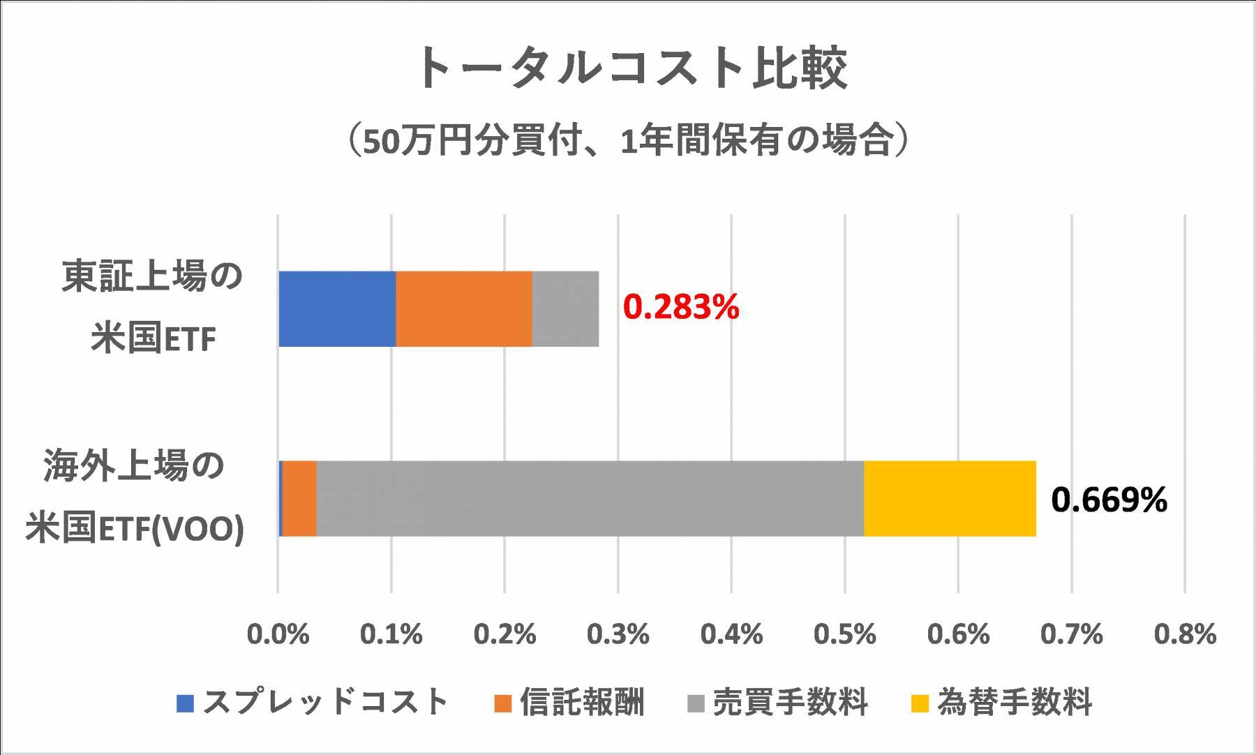 一方、海外上場の米国ETF(VOO)(2)の場合、スプレッドコスト(0.004%)・信託報酬(0.03%)・売買手数料(0.483%)・為替手数料(0.152%)の合計0.669%となり、同じく3,345円のコストを要する結果となりました。