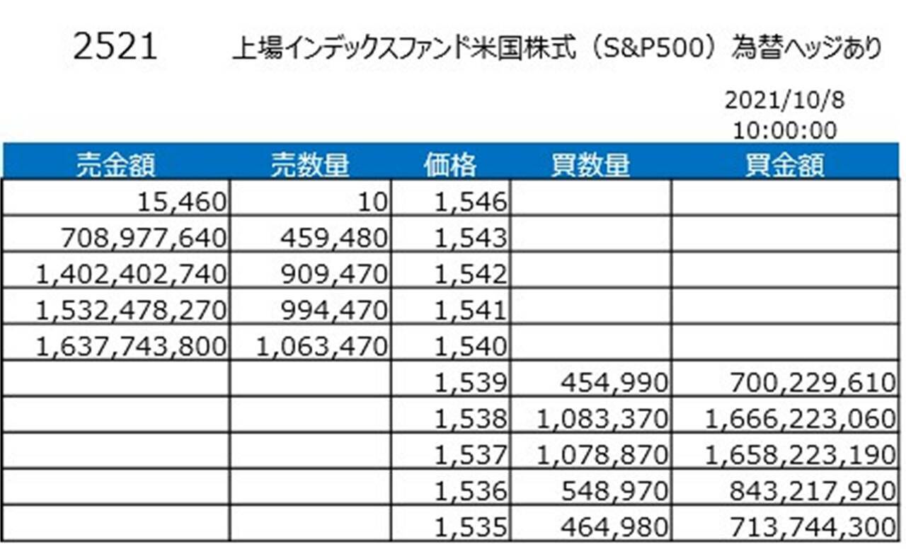 こちらは2021年10月8日10時時点の2521上場インデックスファンド米国株式(S&P500)為替ヘッジありの板の状態です。非常に流動性が高いことがお分かりいただけるかと思います。