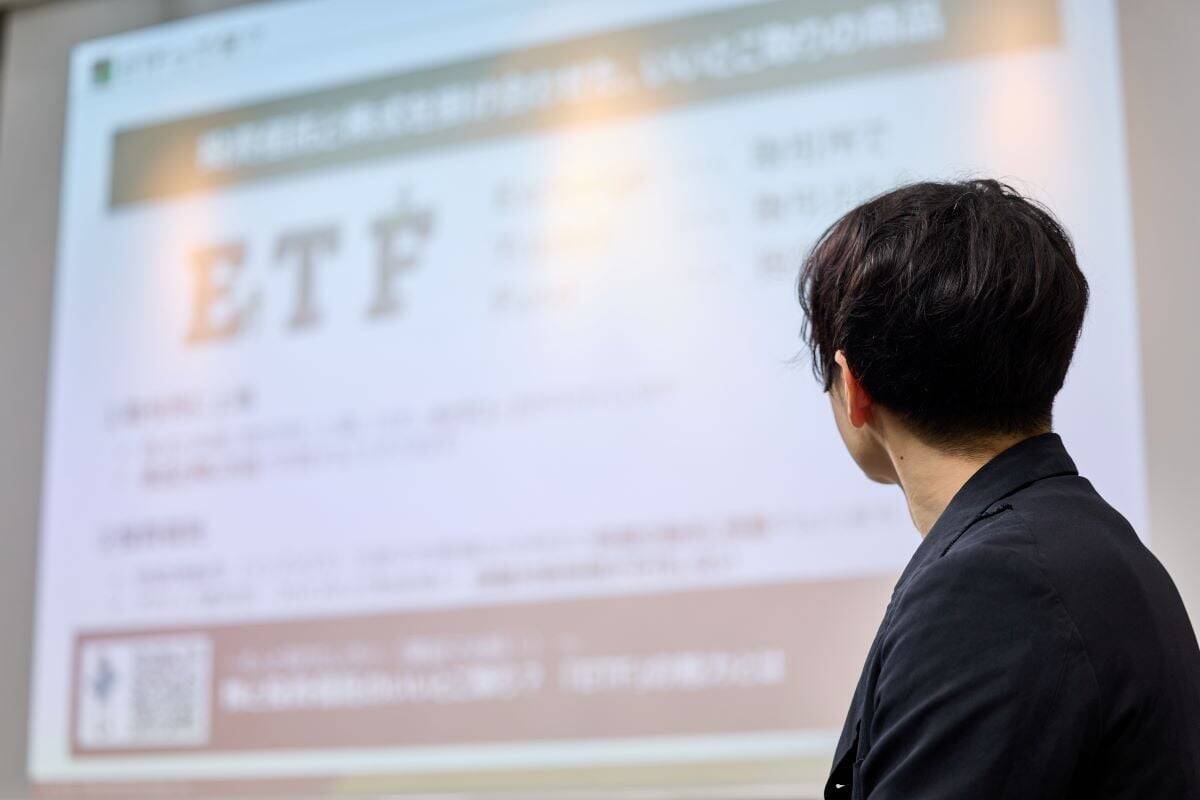 東証「では、まずはETFの特徴から紹介していきましょう。ETFは『Exchange Traded Funds(上場投資信託)』の略で、取引所に上場している投資信託です。上場しているので、株式と同様にリアルタイムで指値での注文ができます。ただ、複数の株式や債券などに投資する投資信託なので、個別株式と比べるとリスクが低いといえます。