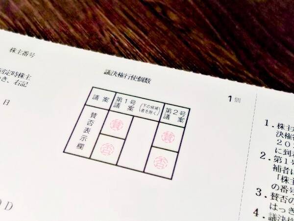 一般的に、議決権行使書には各議案名(例:第1号議案、第2号議案)と「賛」「否」が記載されているため、各議案に賛成であれば「賛」に丸、反対であれば「否」に丸をつけます。電子投票する場合も、指定サイトでコードやパスワードを入力したうえで、賛否の入力が必要です。