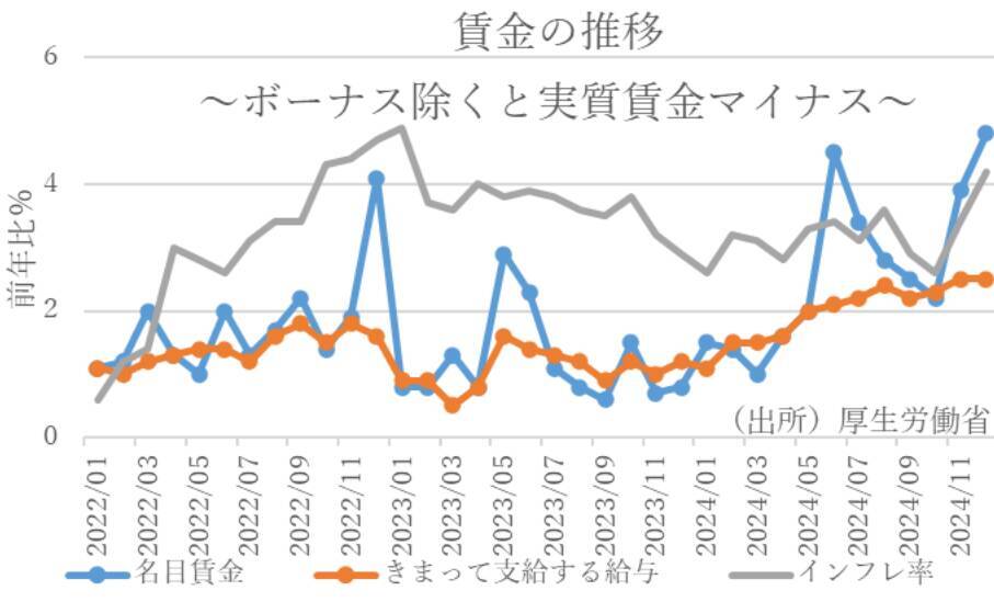 「2024年11月と12月の実質賃金は2カ月連続でプラスになっています。この情報だけ見るといい流れのように感じますが、実質賃金の押し上げに影響しているのは『特別給与』、つまりボーナスです。