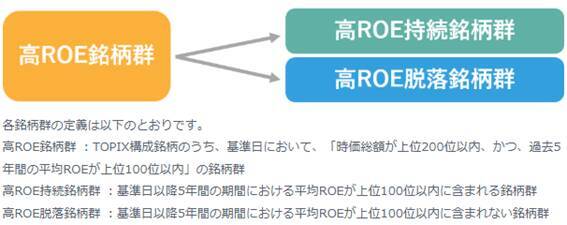ここでは、「過去の高ROE銘柄群」のうち、「将来も高ROEを”持続”した銘柄群」と「将来は高ROEから”脱落”してしまった銘柄群」に分けて、長期的なリターン成績がどう違ったのかを比較してみましょう。