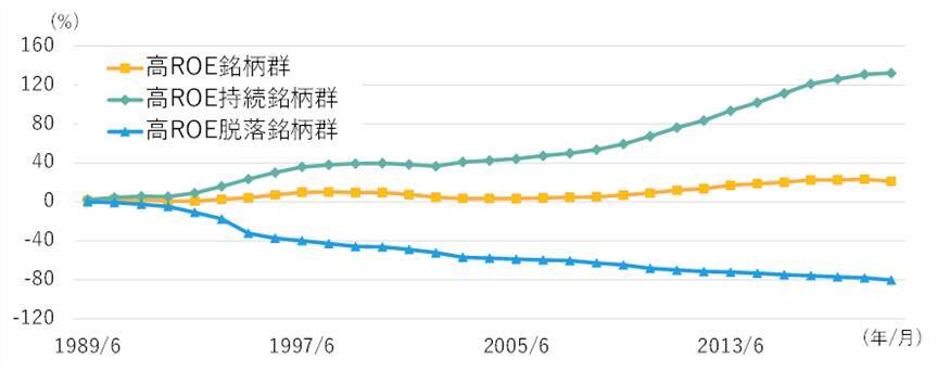 このグラフは大型株(TOPIXの時価総額上位200銘柄)との相対パフォーマンスですから、0%より上を推移していればその銘柄群は母集団となる大型株にリターンで勝っていることを意味します。「過去の高ROE銘柄群」はかろうじてプラス圏を推移していますが、ほとんど0%付近を行ったり来たりしており、株式市場と同程度のリターンしか出ていなかったと分かります。一方、「高ROE持続銘柄群」はしっかりパフォーマンスの成績を伸ばし、「高ROE脱落銘柄群」はどんどん成績が悪くなっています。