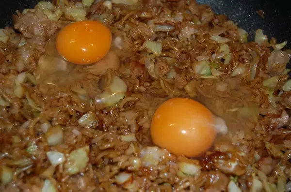 「【リュウジのマルちゃん焼そばを最強にする方法】に挑戦!麺もキャベツも豚肉も徹底的に細かく切れ!」の画像