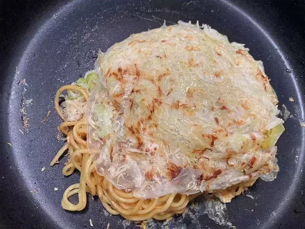 焼きそばの上にお好み焼きをのせる